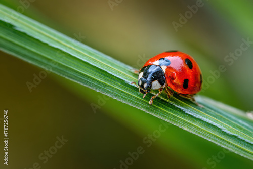 © Emanuel, Obraz premium Macro view of ladybug on a green blade of grass