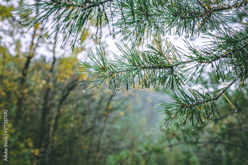 Obraz premium Macro view of needles of pine branches with a ramshackle background.