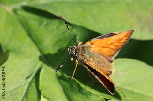 © pilat666, Obraz premium Macro view of vibrant butterfly on green leaf background
