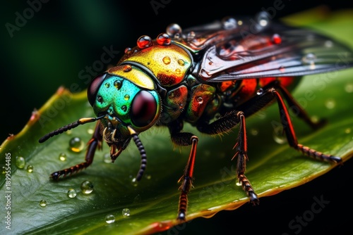 © nsit0108, Fototapeta premium Macro view showing colorful beetle like insect with tiny water droplets on green foliage