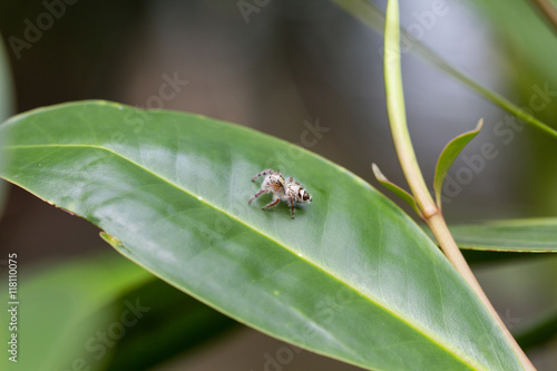 Fototapeta premium Macro White Island jumping spider on a green leaf