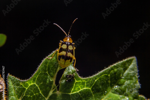 © Angela, Fototapeta premium Macrofotografia de um besouro em folha com fundo preto.