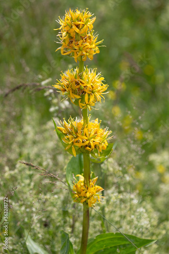 © panosud360, Fototapeta premium Macrophotographie de fleur sauvage - Gentiane jaune - Gentiana lutea