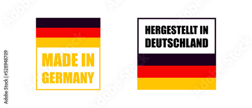 © suicidestock, Fototapeta premium Made in Germany label set. Made in Germany stamp. Big set of label, stickers, pointer, badge, symbol and page curl with German flag icon on design element.