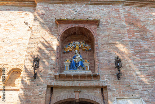 © Richard Semik, Obraz premium Madonna and Child statue on old brick wall
