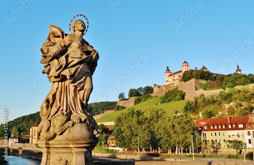 © Franz Gerhard, Fototapeta premium Madonna, Würzburg, Alte Mainbrücke und Festung