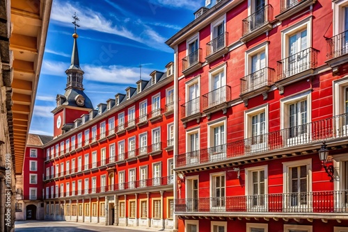 © Four888, Fototapeta premium Madrid Plaza Mayor Red Facade White Shutters - Spanish Architecture Stock Photo