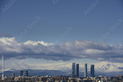 Obraz premium Madrid Skyline from the air, snowy in the background mountains