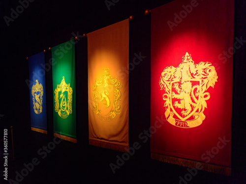 Fototapeta premium MADRID, SPAIN - NOV 22, 2017: 4 faculties logos, Wizarding world of Harry Poter experience in Madrid, Spain