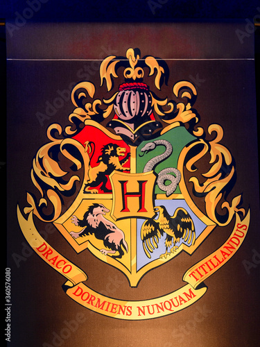 Obraz premium MADRID, SPAIN - NOV 22, 2017: Hogwarts school logo, Wizarding world of Harry Poter experience in Madrid, Spain