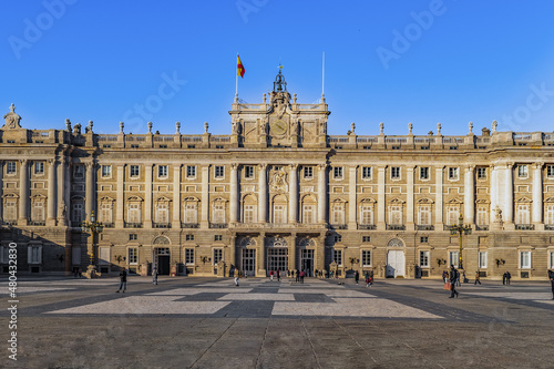 © ioanna_alexa, Fototapeta premium Madrid, Spain - November 30, 2021: Front view of the Royal Palace of Madrid. View from the Plaza de la Armeria on the main facade of the Spanish castle