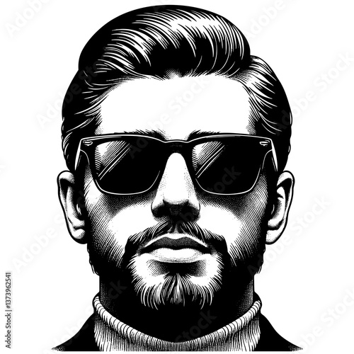 © Oleksandr Pokusai, Fototapeta premium Mafioso man wearing a suit, tie, and sunglasses, exuding sophistication and elegance sketch engraving generative ai PNG illustration. Scratch board imitation. Black and white image.