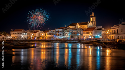 Fototapeta premium Magdalena Festival Night Celebration with Fireworks Over Historic Portuguese Town