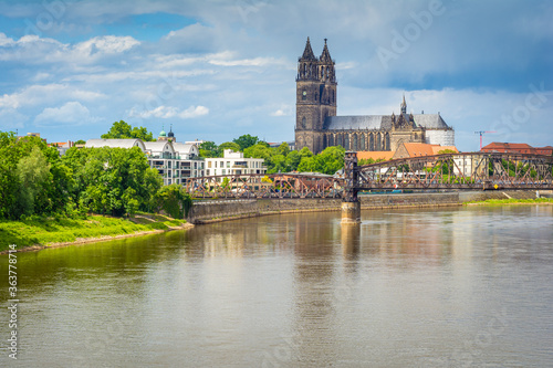 Fototapeta premium Magdeburger Dom und Elbe in Magdeburg nach einem Gewitter im Sommer