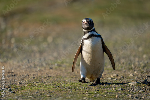 Naklejka premium Magellanic penguin crosses flat ground lifting foot