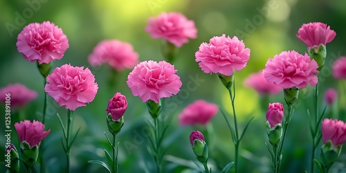 © Zeeshan, Fototapeta premium Magenta carnation blossoms closeup fresh vibrant lush green background