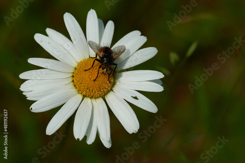 © Karin Jähne, Fototapeta premium Magerwiesen-Margerite mit Igelfliege - Tachina fera