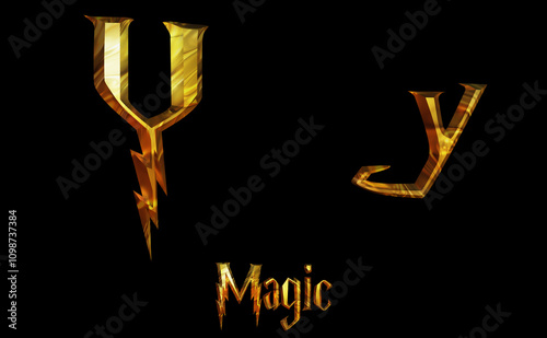 © SIBPOP, Naklejka premium Magic Alphabet golden font letters 3 D render Illustration
