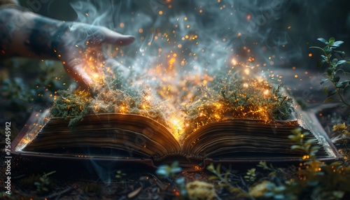 © paisorn, Obraz premium Magic and fabulous creations fly out of the magic open book, fantasy setting