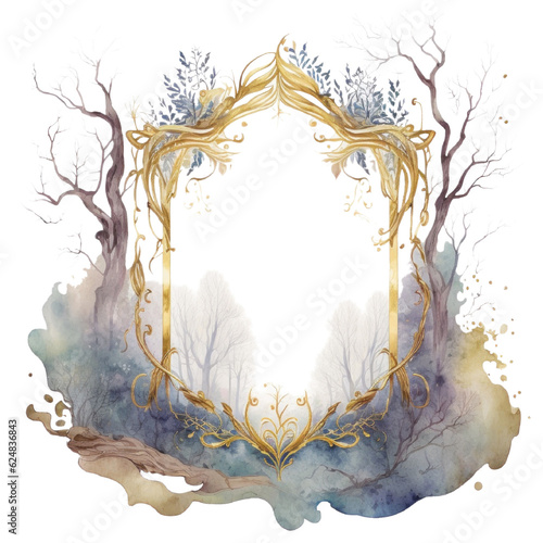 © NadyaSaen , Naklejka premium Magic forest gold frame with trees and brunches, wooden frame watercolor illustration isolated with a transparent background, enchanted forest fantasy design created with Generative AI