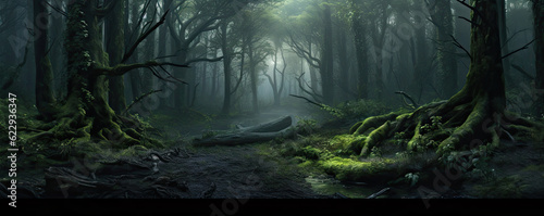 © Michal, Fototapeta premium Magic forest in dark background. wide banner