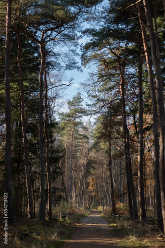 © Francesca, Fototapeta premium Magic forest path with pine trees, walking in autumn colors.