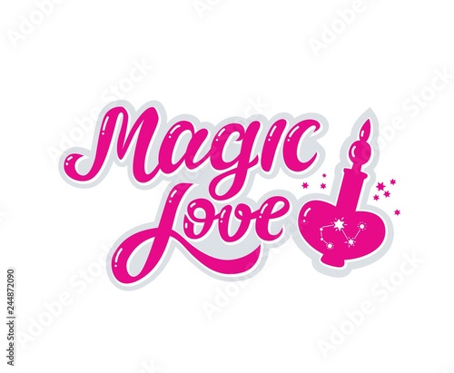 Obraz premium Magic love hand drawn text and a bottle of a love potion illustration.