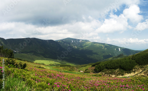 Fototapeta premium Magic pink rhododendron flowers in the mountains.