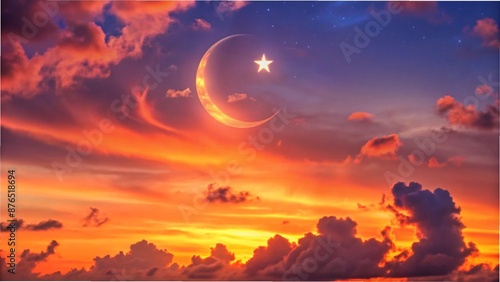 Fototapeta premium magic ramadan cloudscape sky with crescent moon star and evening sun, eid...