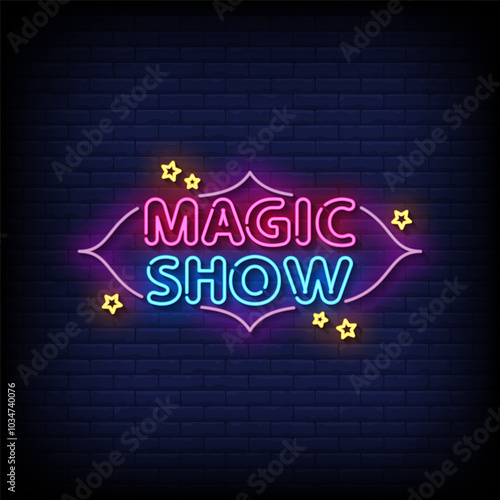 © bohlam, Obraz premium magic show neon sign vector with brick wall background