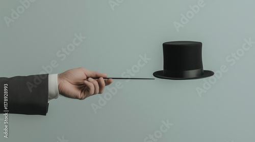 Fototapeta premium Magic trick with a hand holding a wand and a floating black top hat against a minimal background. Generative AI