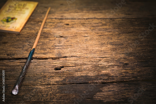 Obraz premium Magic wand on wooden table, Magic wand Wizard tool on vintage wooden background.