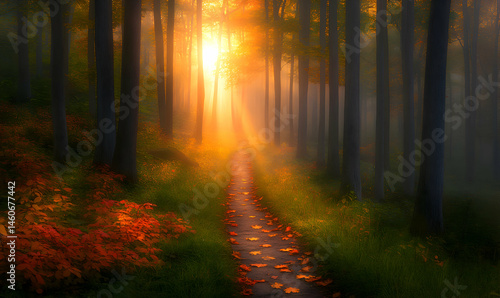 Fototapeta premium Magical autumn forest path at sunrise, sunbeams through trees, leaves on path, mystical atmosphere.