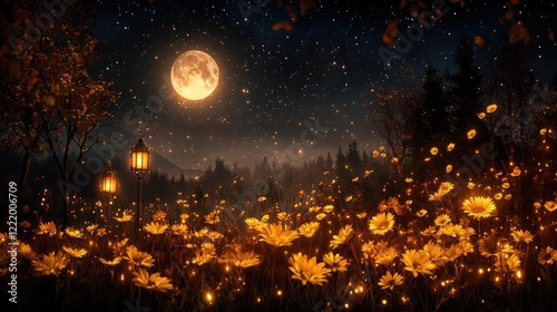© BROPRADANA, Naklejka premium Magical autumn night, moonlit flower field, glowing lanterns, misty forest background; fantasy art