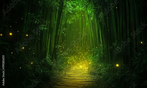 Naklejka premium Magical Bamboo Forest Path Illuminated By Fireflies