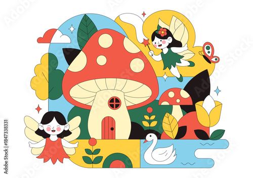 © denayune, Obraz premium Magical Beautiful Flying Fairy Vector Illustration with Elf, Landscape, Tree, and Green Grass in a Flat Style Kids Cartoon Background