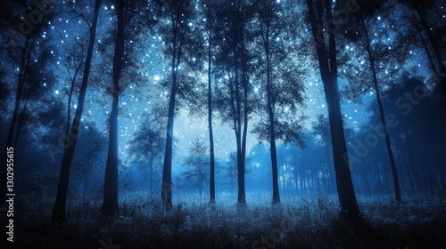 Obraz premium Magical blue forest at night under starry sky.