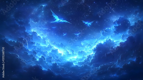 Fototapeta premium Magical Blue Sky with Glowing Fish and Flying Dragons Above Clouds