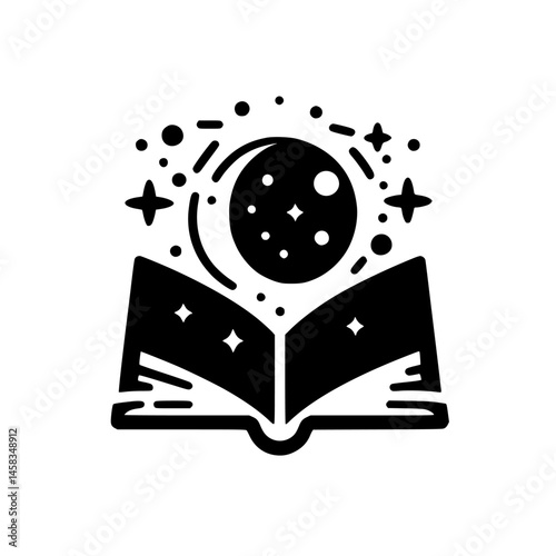 © MatandSterre, Fototapeta premium Magical Book & Moon: Black & White Celestial Illustration