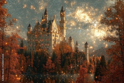 © Rangga Bimantara, Fototapeta premium Magical castle at night, autumn forest, starry sky. Possible use wallpaper, greeting card