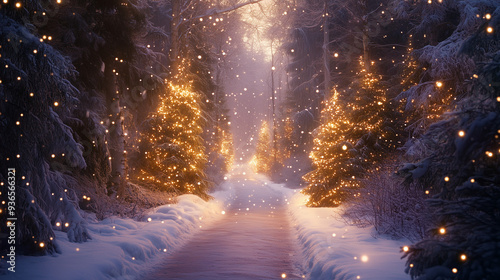 © Naseem, Naklejka premium Magical Christmas Evening with Snowy Path, Twinkling Lights, and Cozy Winter Forest for Seasonal Decorations