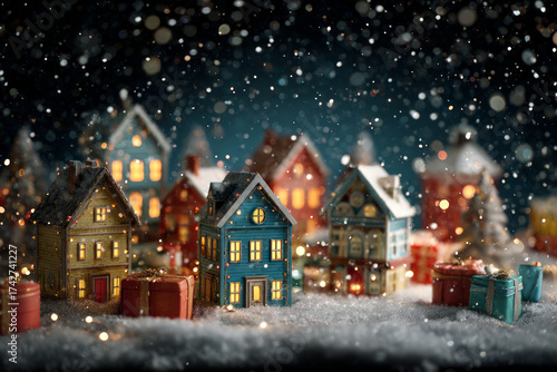 Fototapeta premium Magical christmas village with glowing house in snow with festive present