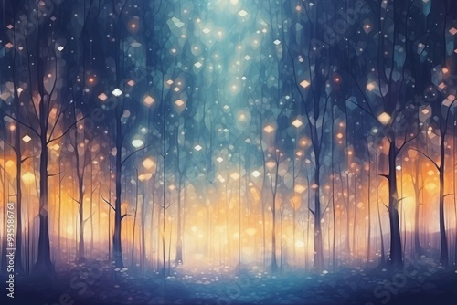 © Acronym, Fototapeta premium Magical Christmas watercolor forest with shining lights. Fairytale abstract illustration style. Holiday celebration concept.