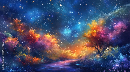 © Mega, Naklejka premium Magical colorful forest path under a vibrant starry night sky.