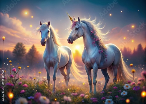 © Four888, Fototapeta premium Magical Dusk: Unicorns in a Glowing Meadow - High-Resolution Stock Photo