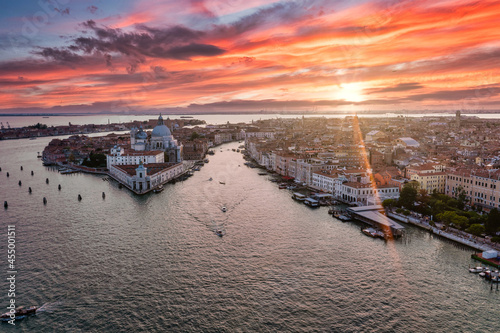 Naklejka premium Magical evening sunset view over beautiful Venice in Italy. Aerial view of...