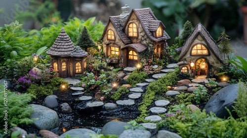Obraz premium magical fairy garden with tiny houses and glowing lights