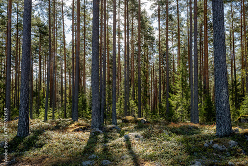 © Conny Sjostrom, Fototapeta premium Magical fairytale pine forest. Forest therapy and stress relief.