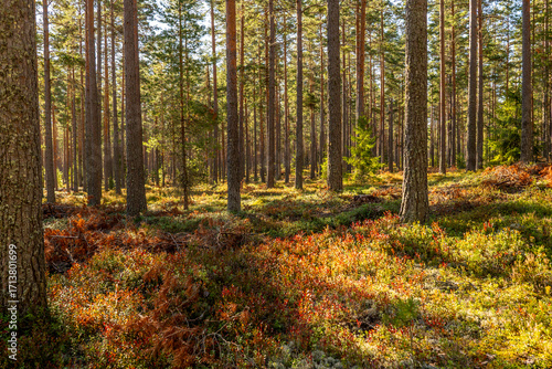 © Conny Sjostrom, Obraz premium Magical fairytale pine tree forest in autumn forest therapy and stress relief