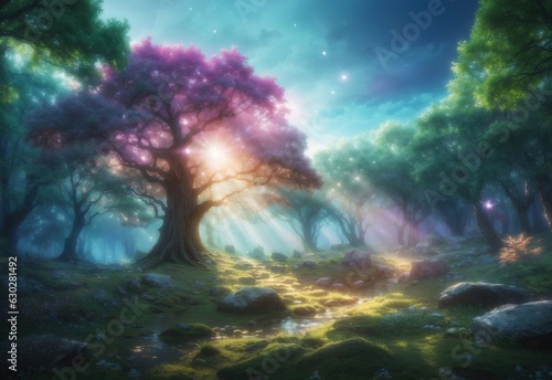 © Jasmine, Obraz premium Magical fantasy forest landscape with magical light around